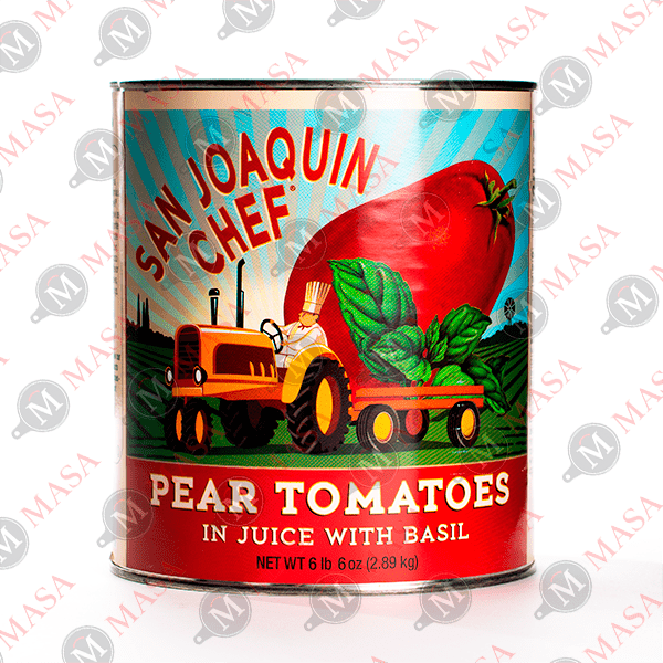 Tomate californiano entero pelado (sin cáscara) en jugo, marca San Joaquin de Pastorelli.